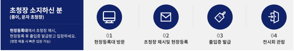 초청장을 소지하신 분은 현장 등록대에서 초청장을 보여드리고 현장에서 등록 절차를 밟은 후에 출입증을 발급받고 입장하시면 됩니다!