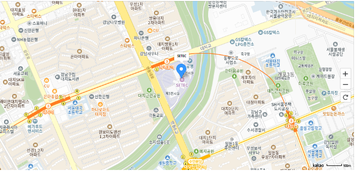 서울 강남구 남부순환로 3104 SETEC으로 오시면 됩니다! 학여울역 1번 출구에 자리 잡고 있습니다! 대중교통을 이용한다면 본인 위치에서 오는 방법을 알려드릴 테니 확인해 보세요!
